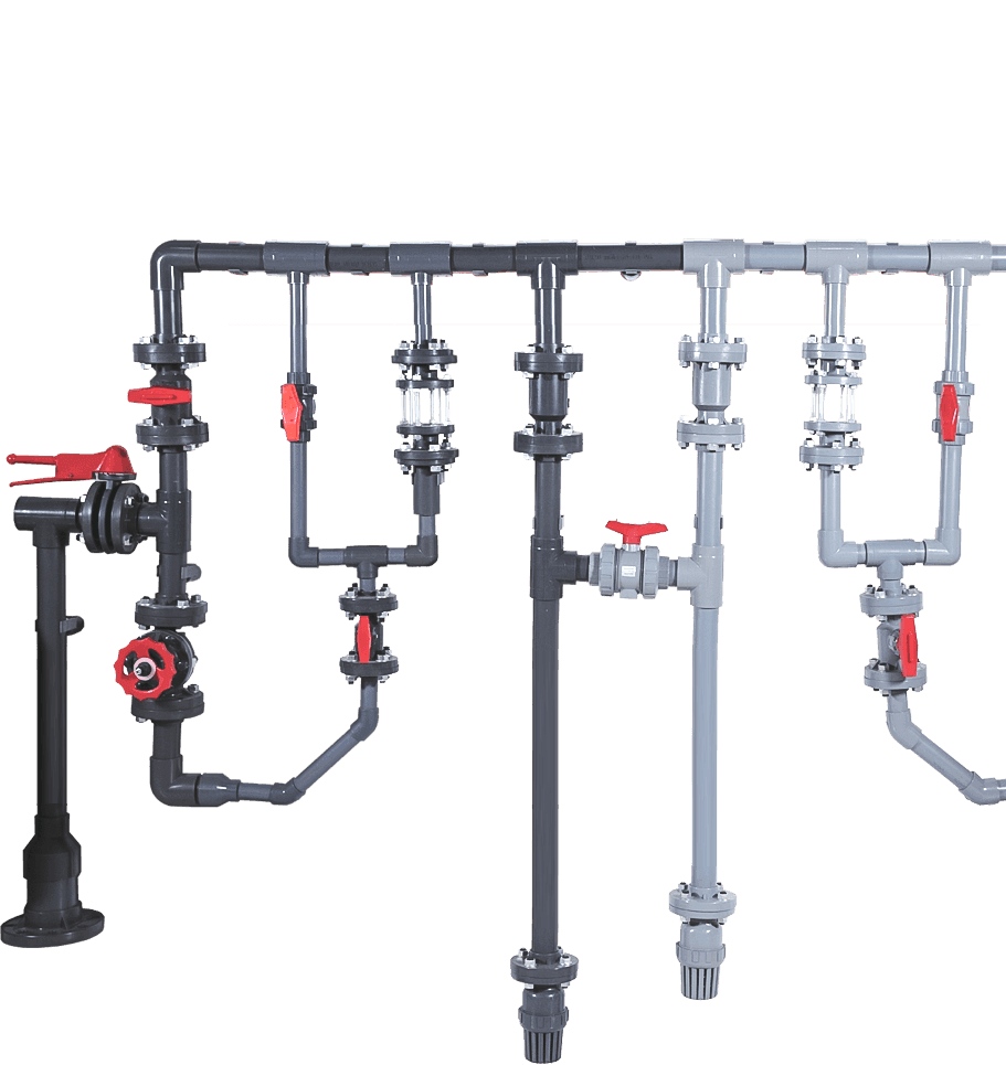 閥門(mén)系列產(chǎn)品如:隔膜閥、蝶閥、球閥、截止閥、止回閥、耐腐蝕泵等。主要材質(zhì)有CPVC、UPVC、PVDF、PPH、FRPP等。